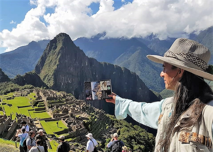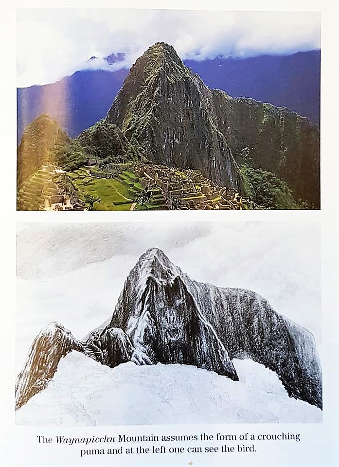 During the one hour climb to the Sun Gate on 15 April 2019, it was wonderful listening to many stories that our lovely guide Mallku shared. His love for the genuine history of his Inkan ancestors is very deep and sincere, shared through several books that he wrote and his many tours. At one point we stopped at the location where the view of the entire Machu Picchu complex was fantastic. While looking at the shape of the magnificent Machu Picchu and Wayna Picchu apus (mountain, or more specifically, the spirit of the mountain), Mallku shared with me the amazing images displayed on the front and back cover of his book “The Crystal City of Machu Pijchu”, helping me to identify those shapes on the spectacular mountains in front of us.