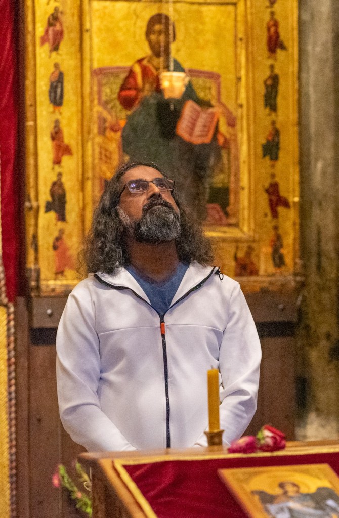 Kao prvo, bilo mi je skroz posebno to što je Mohanđi svesrdno učestvovao u ovom hodočašću, pomno pratio i osećao energije, učio o istoriji manastira, iako ne pripada hrišćanskoj veri i tradiciji. Svo vreme sam uglom oka pratila njegove reakcije i momente kada bi se sa izrazom dubokog poštovanja i prepoznavanja zagledao u neku fresku ili detalj u okviru manastira, sa svog nivoa svesti videvši ko zna šta.